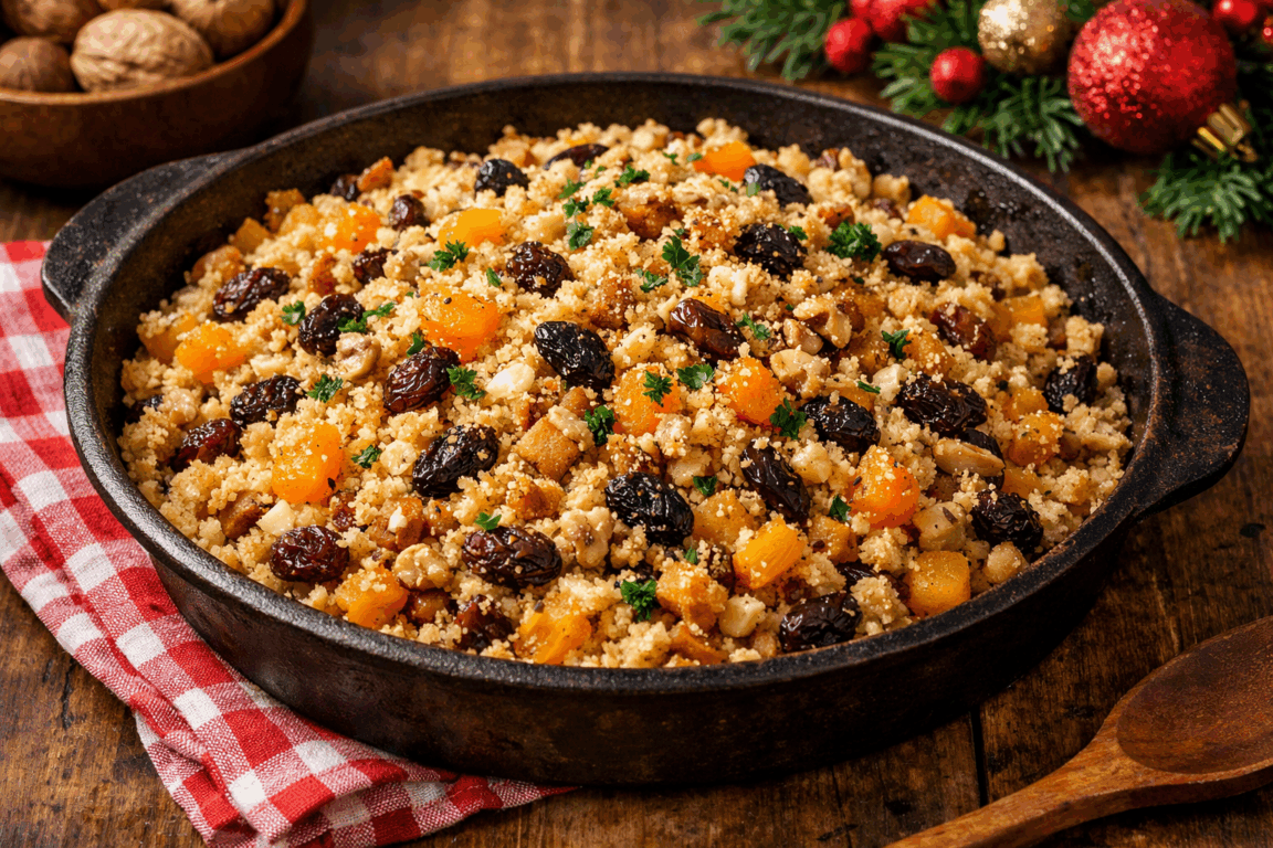 Acrescente as uvas-passas, os damascos e as nozes. Tempere com sal e pimenta a gosto.
