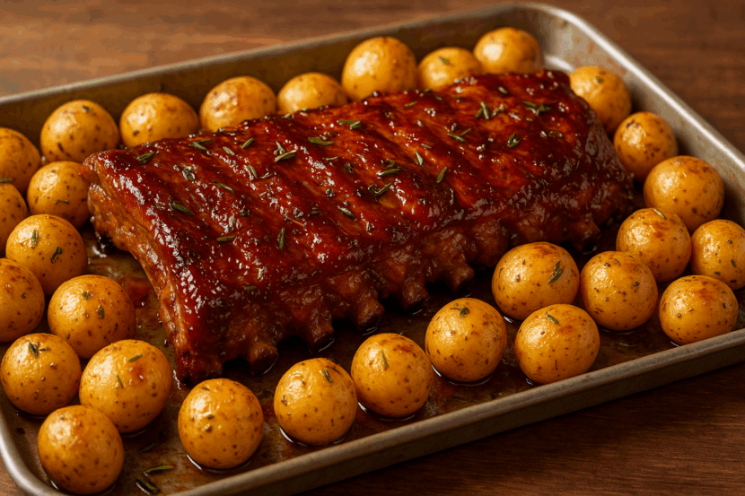 Leve a costelinha para uma forma untada e adicione junto as batatas baby ao redor com azeite e sal para o forno pré aquecido à 170° por 1 hora com papel alumínio por cima.