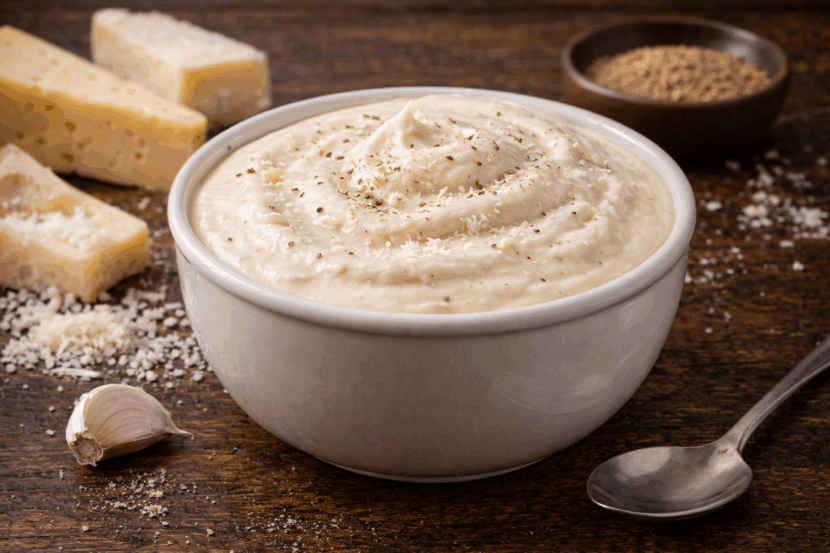 Em um liquidificador vamos bater o requeijão, o parmesão, o provolone, o alho, o leite e o óleo.