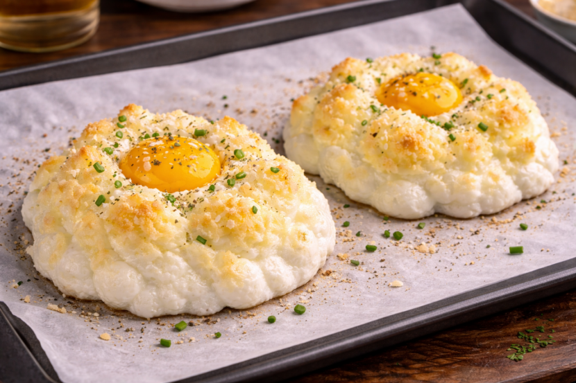 Faça dois montinhos com a clara e então, com o auxílio de uma colher, abra um buraco no meio de cada “bolinho”.