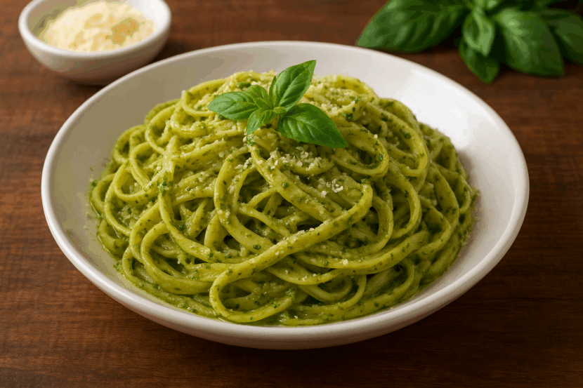 Em um processador de alimentos, misture o manjericão, queijo parmesão, azeite de oliva, nozes e alho até obter uma pasta homogênea.