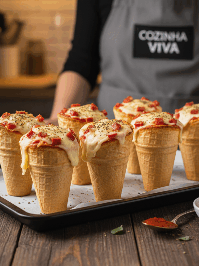 Após disponha os cones em pé em uma assadeira um ao lado do outro.