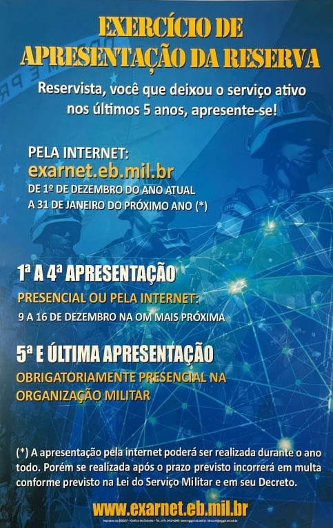 A Junta do Serviço Militar convoca para a apresentação da Reserva 2025 os integrantes da reserva do Exército Brasileiro no período de 9 a 16 de dezembro de 2025. Os reservistas que precisam se apresentar são os que tenham se afastado do serviço ativo no período de 1º de dezembro de 2020 a 30 de novembro de 2025 (inclusive) e se enquadrem nos seguintes quesitos.