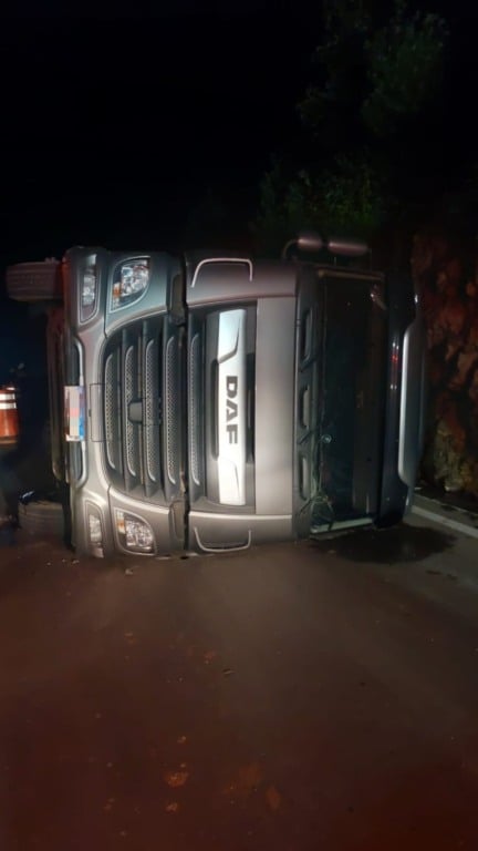 Bento Gonçalves e Veranópolis - Uma carreta tombou no km 194 da BR-470, na Serra das Antas, entre Veranópolis e Bento Gonçalves, na noite desta quarta-feira (1º). O caminhão, com placas de Farroupilha, permanece tombado sobre a pista.