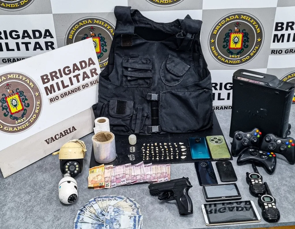 Com os presos, os PMs encontraram duas câmeras de monitoramento, R$ 125 em dinheiro, um aparelho de vídeo game (Xbox 360) com três controles, um tablet, um GPS, quatro celulares, duas lâminas para fracionar drogas, um simulacro de pistola, um rolo de plástico filme, um rolo de saco plástico usado para armazenar drogas, um capa de colete e dois rádios comunicadores.