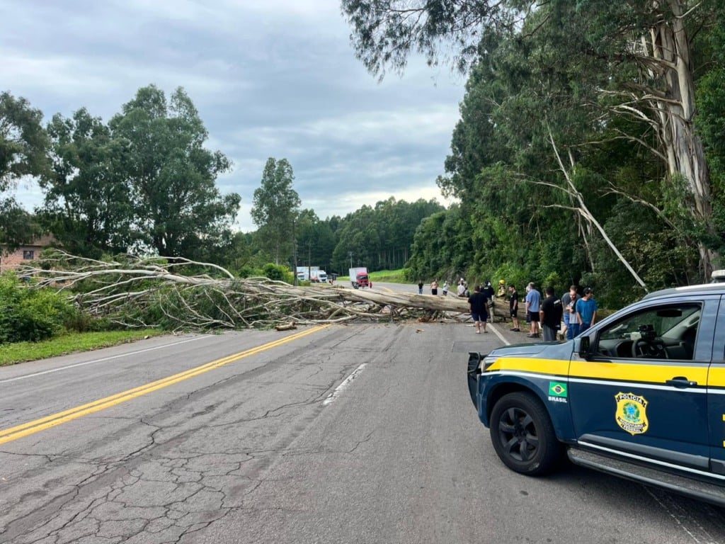 Caxias do Sul e São Marcos - Uma árvore de grande porte caiu na faixa de rolamento da BR-116, no km 127, entre Caxias do Sul e São Marcos, na manhã deste sábado (27) e bloqueia totalmente a rodovia. A ocorrência foi registrada na altura do antigo pedágio de São Marcos.