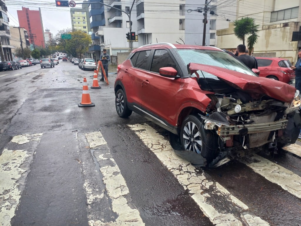 Um acidente envolvendo três veículos foi registrado no Centro de Caxias do Sul, no início da tarde desta sexta-feira (3). A colisão ocorreu quando um Peugeot trafegava pela Andrade Neves sentido rodoviária, um ônibus saía da rodoviária para acessar a rua 20 de Setembro, e um Nissan Kicks vinha pela própria 20 de Setembro.