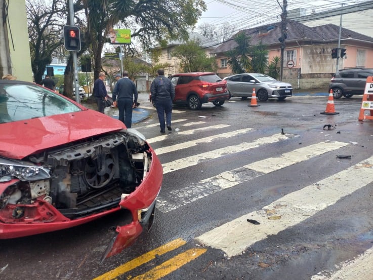 Um acidente envolvendo três veículos foi registrado no Centro de Caxias do Sul, no início da tarde desta sexta-feira (3). A colisão ocorreu quando um Peugeot trafegava pela Andrade Neves sentido rodoviária, um ônibus saía da rodoviária para acessar a rua 20 de Setembro, e um Nissan Kicks vinha pela própria 20 de Setembro.