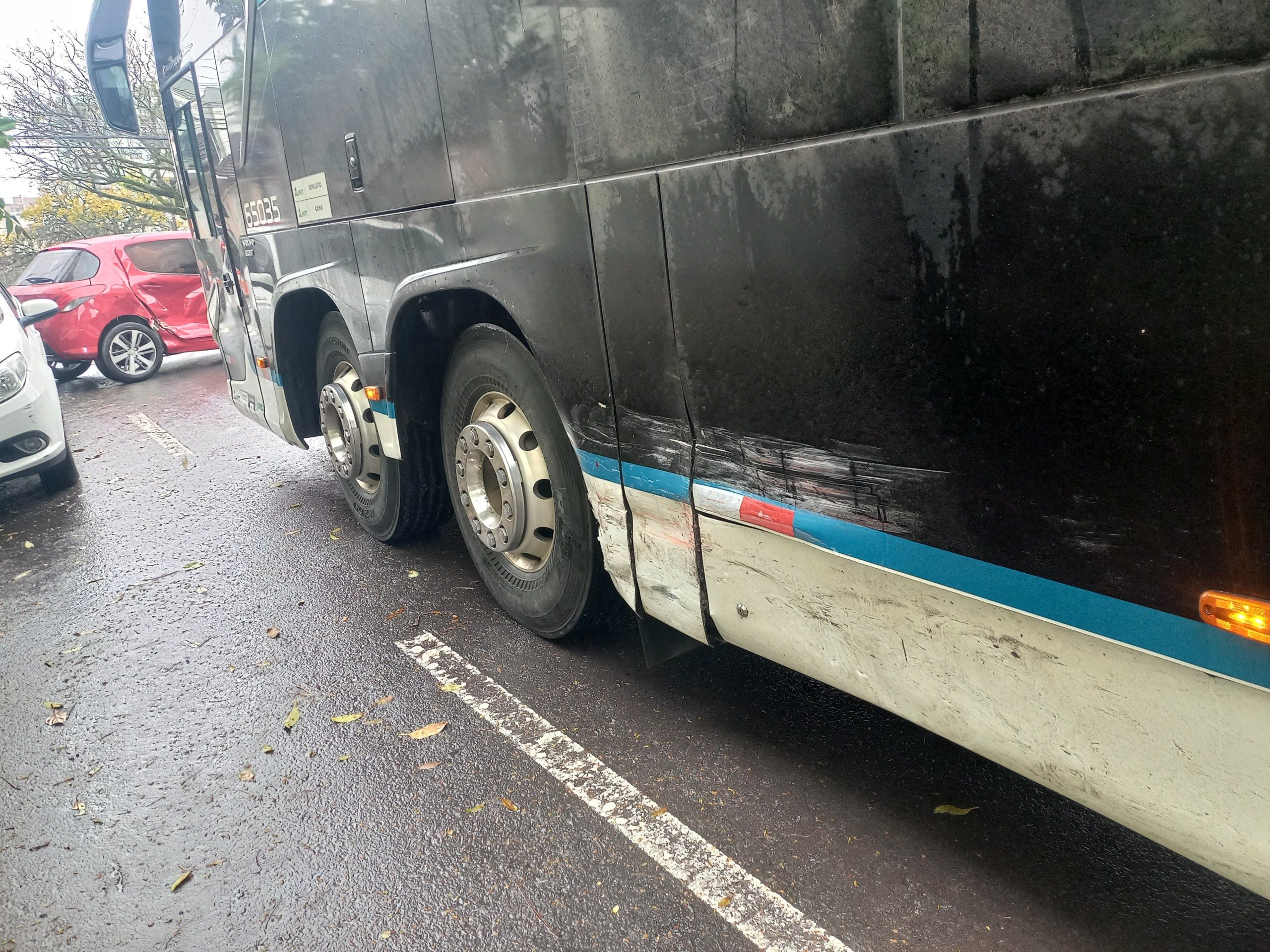 O ônibus, de uma empresa de transporte, estava sem passageiros no momento do acidente e permanece parado no local. O trânsito está parcialmente bloqueado, e agentes da Fiscalização de Trânsito acompanham a ocorrência.
