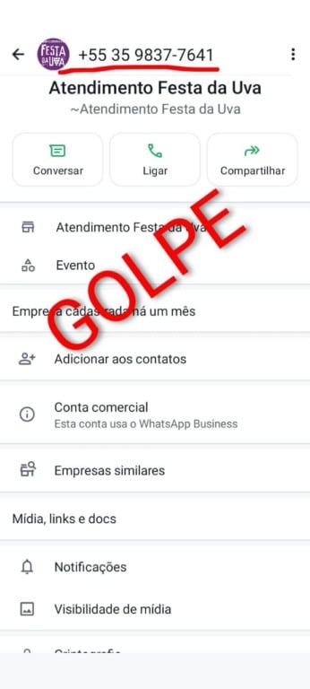 A organização da Festa da Uva reforça que não realiza solicitações financeiras, pedidos de dados sensíveis ou atendimentos oficiais por meio de ligações ou mensagens suspeitas.
