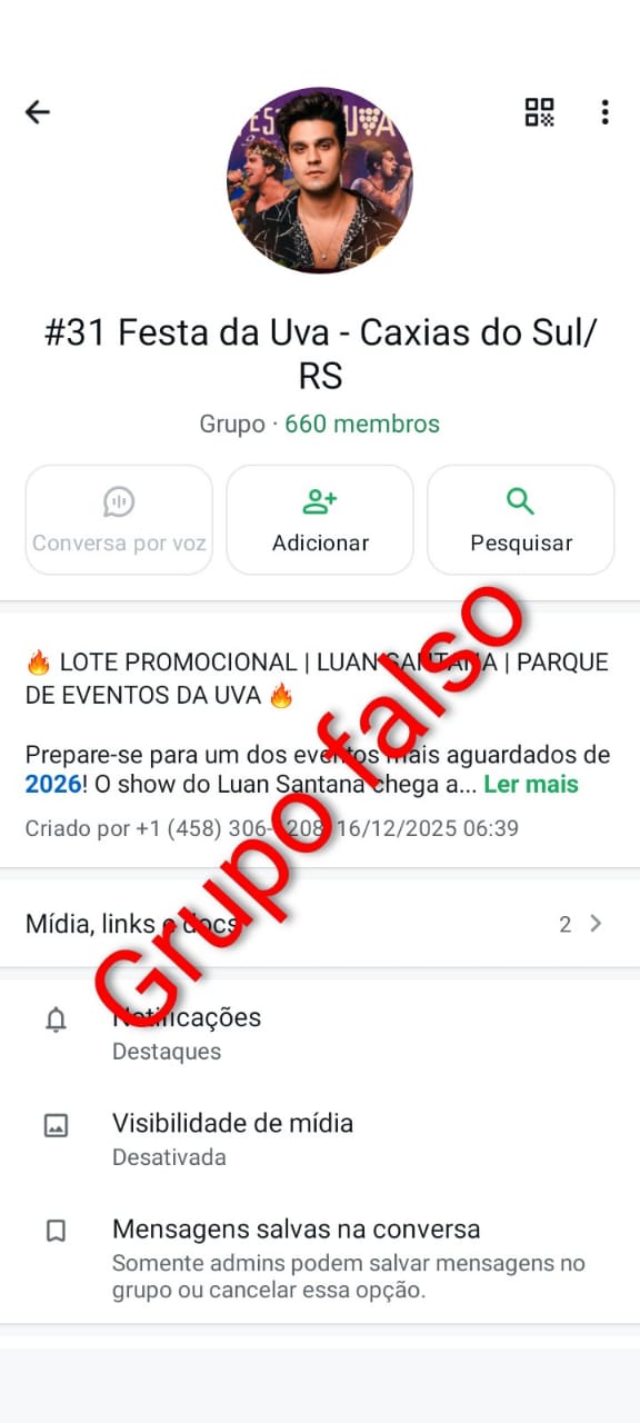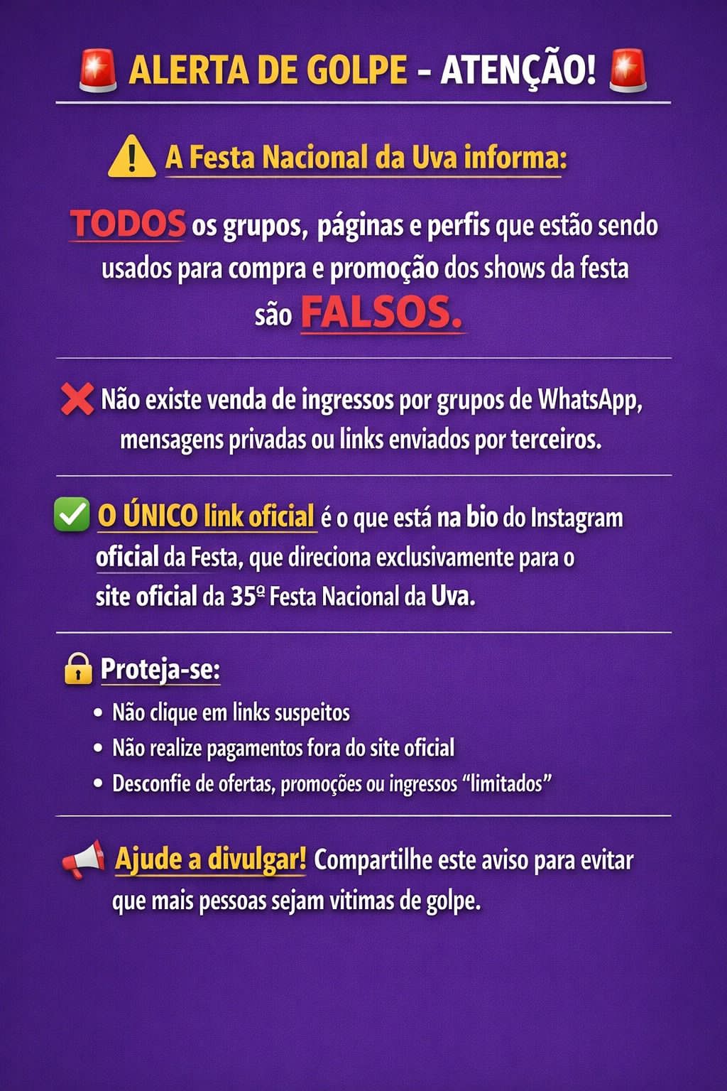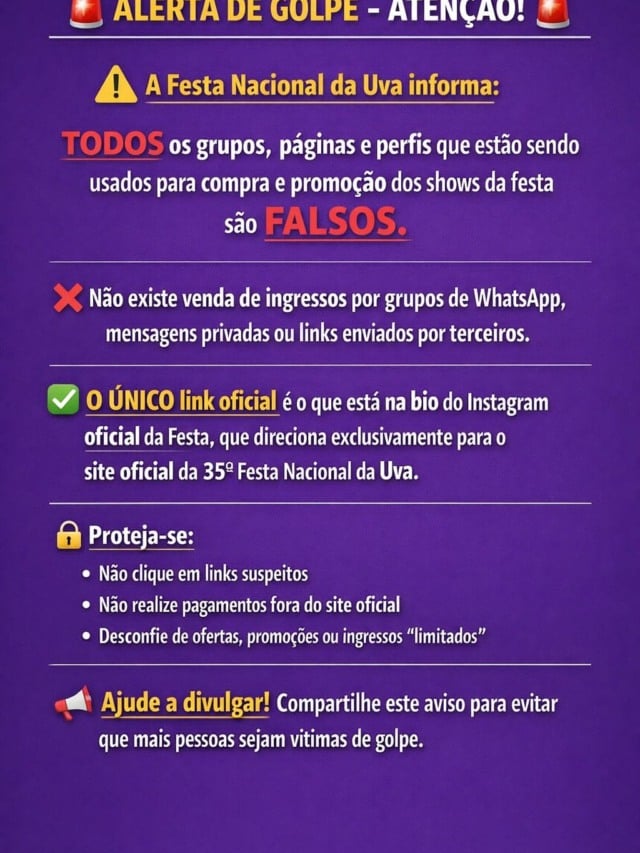 A organização da Festa da Uva reforça que não realiza solicitações financeiras, pedidos de dados sensíveis ou atendimentos oficiais por meio de ligações ou mensagens suspeitas.