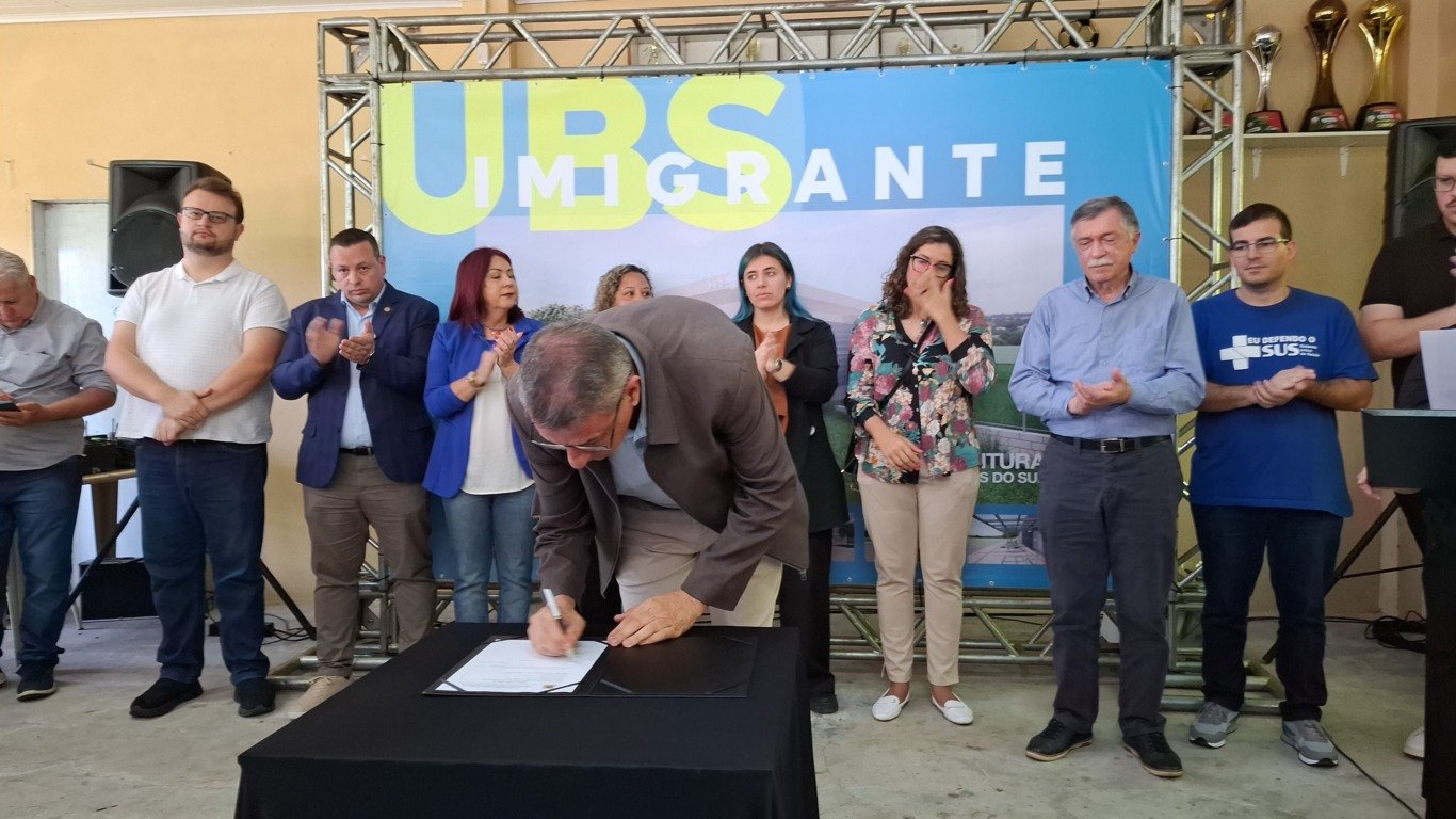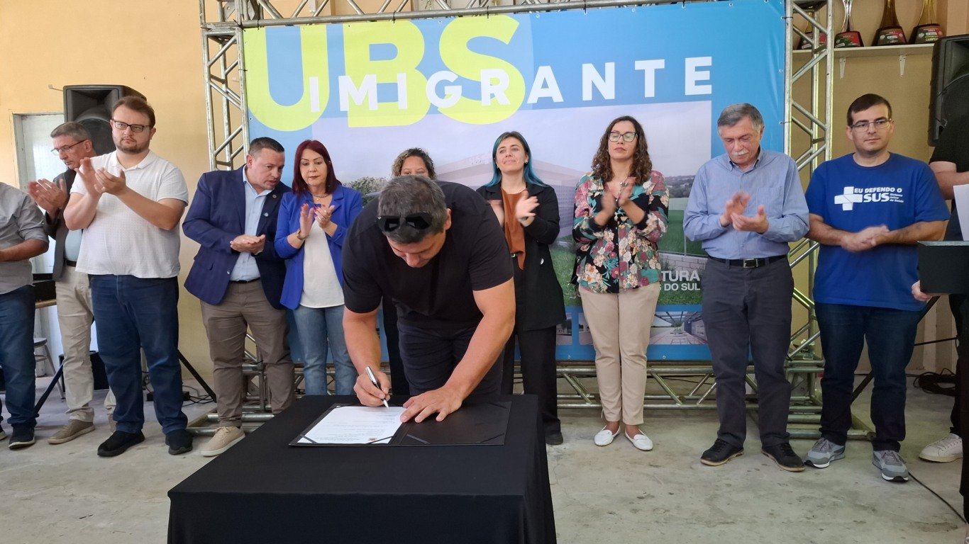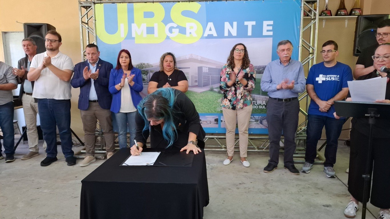A Prefeitura de Caxias do Sul assinou na manhã deste sábado (11) a ordem de início das obras da Unidade Básica de Saúde (UBS) Imigrante, no bairro Nossa Senhora das Graças. A cerimônia ocorreu no Centro Comunitário do bairro e reuniu autoridades municipais e representantes da comunidade, entre eles o prefeito Adiló Didomenico, a deputada federal Denise Pessôa, os secretários municipais Rafael Bueno (Saúde) e Adriano Bressan (Urbanismo), além de vereadores e lideranças locais.