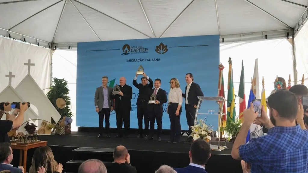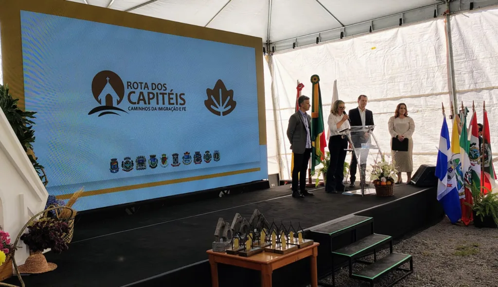 Com uma cerimônia oficial na Capela Santo Antônio, em Monte Belo do Sul, foi inaugurada na manhã desta terça-feira (6) a sinalização da “Rota dos Capitéis — Caminhos da Fé e Imigração”. Autoridades, lideranças locais e moradores participaram do evento, que marca mais um capítulo nas comemorações dos 150 anos da imigração italiana no Rio Grande do Sul.
