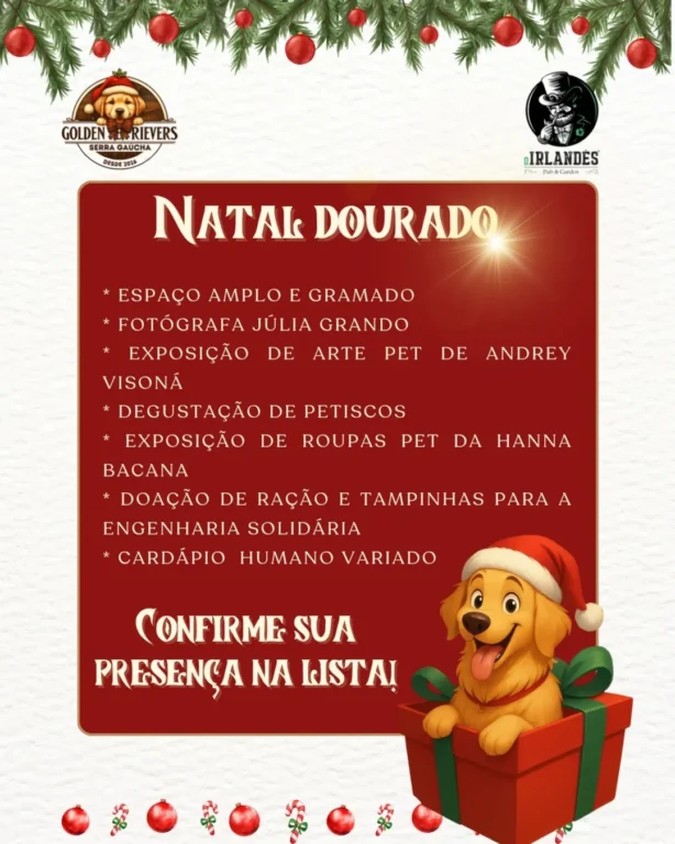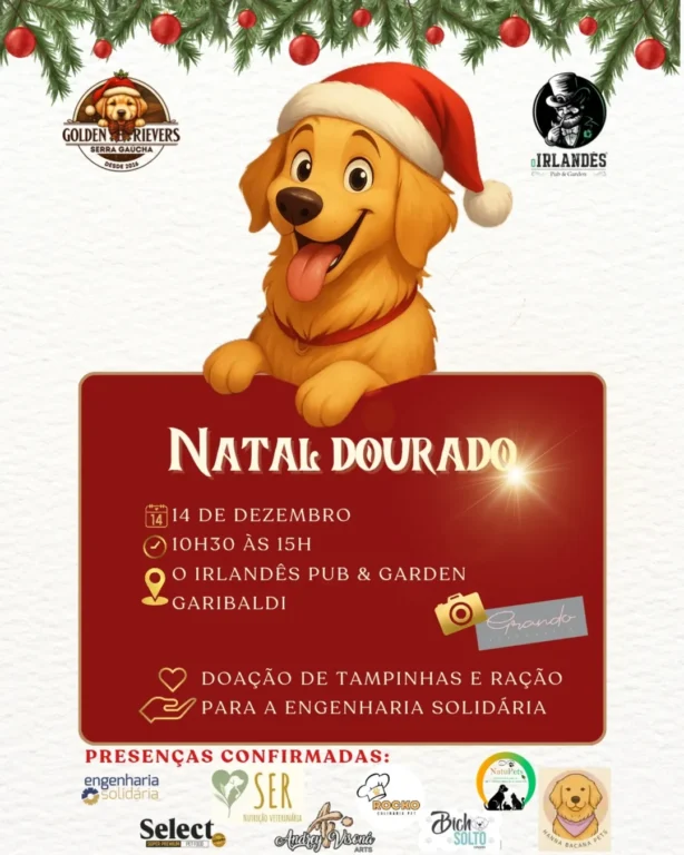 O grupo Golden Retrievers Serra Gaúcha promove no dia 14 de dezembro, das 10h30 às 15h, o Natal Dourado, encontro de tutores e cães que une confraternização e solidariedade. Pela primeira vez, o evento será realizado em Garibaldi, no espaço O Irlandês Pub & Garden.