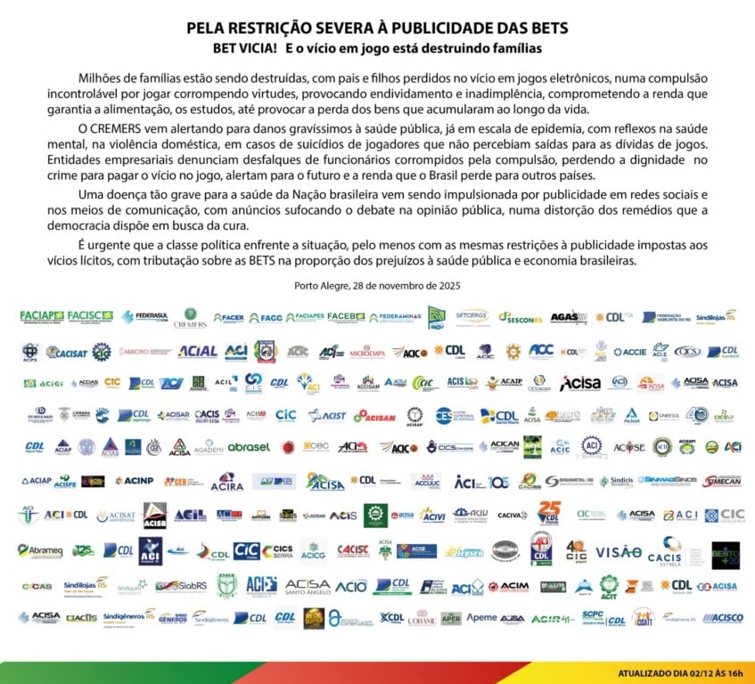 O documento, que já tem a adesão de dezenas de entidades gaúchas, também tem o aval do Conselho Regional de Medicina do RS (Cremers). O texto abre com o alerta de que bet vicia e que “o vício em jogo está destruindo famílias”. Além de aumento da tributação, pede a políticos uma restrição semelhante à publicidade de outros produtos com este efeito. Em geral, se referem a cigarros.
