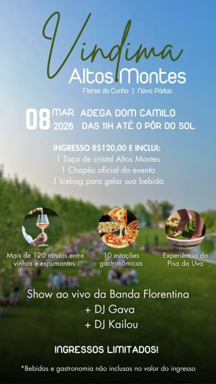 A Região dos Altos Montes, que abrange os municípios de Flores da Cunha e Nova Pádua, na Serra Gaúcha, apresenta a Vindima Altos Montes. O evento foi criado para celebrar a energia, os aromas e as tradições que tornam esta época do ano tão especial. Uma experiência inesquecível, celebrando com os melhores vinhos, espumantes e gastronomia na época mais importante para a vitivinicultura: a Vindima.