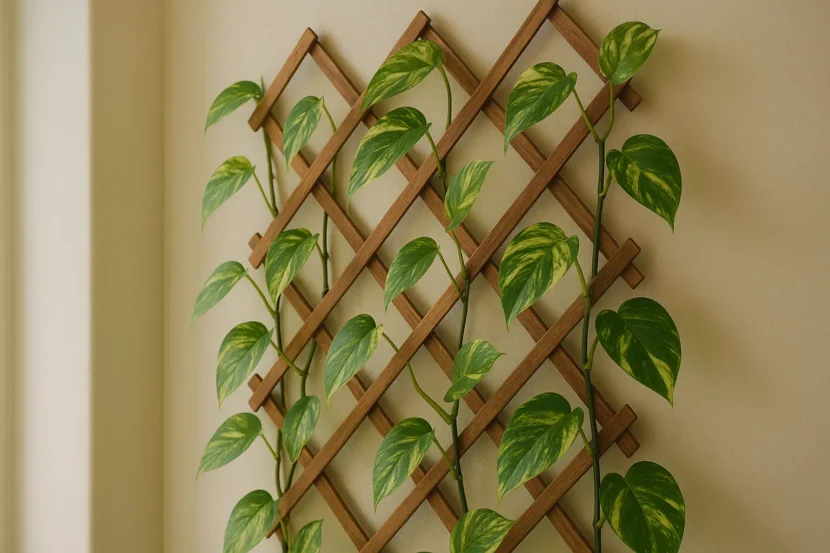 Ao fixar os galhos nos vãos da treliça, é possível criar desenhos personalizados e conduzir o crescimento de forma artística. Dá para formar um “zigue-zague” elegante, uma moldura viva em volta de quadros, ou até um painel inteiro cobrindo a parede. O visual da planta ganha imponência, mas com controle — e o ambiente agradece.