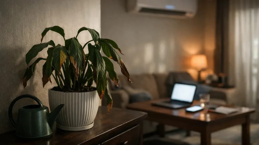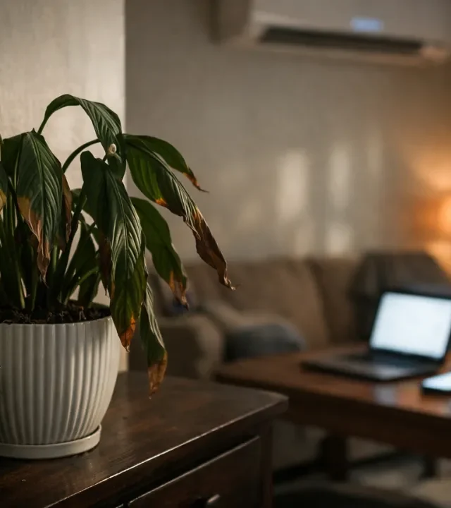 Além disso, o lírio-da-paz não seca apenas por falta de água. Ambientes com ar-condicionado constante, ventiladores ligados o dia inteiro e luz indireta excessivamente fraca criam um cenário silencioso de estresse contínuo. A planta sofre aos poucos, enquanto a casa parece perfeitamente organizada.