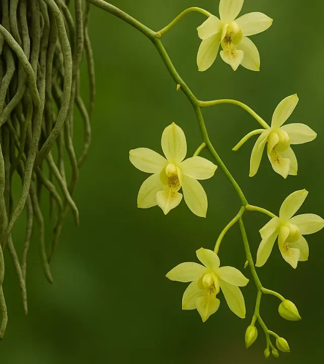 Quando entra em floração, a Chiloschista quangdangii se transforma em um espetáculo visual. As flores, pequenas e perfumadas, surgem em hastes que parecem flutuar, já que não há folhas para sustentá-las. Essa aparência etérea é o que faz muitos a chamarem de “orquídea fantasma”. O contraste entre suas raízes prateadas e as flores em tons de amarelo, verde ou lilás cria uma composição que parece saída de um quadro botânico.