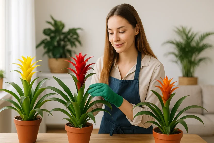Uma das dúvidas mais comuns é: “A Guzmânia floresce só uma vez?”. Tecnicamente, sim — cada roseta floresce uma vez, mas a planta gera brotos laterais chamados “filhotes”. Quando os filhotes atingem cerca de um terço do tamanho da planta-mãe, podem ser separados e replantados.