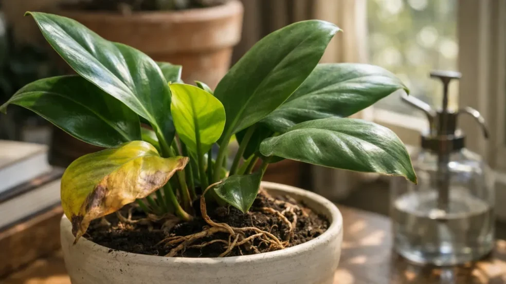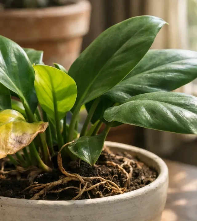 Quem cultiva o pacová-verde em vasos muitas vezes ignora o que acontece sob a terra. Essa planta desenvolve um sistema radicular espesso e vigoroso, que rapidamente preenche o espaço disponível. Quando o vaso fica pequeno demais para as raízes, dois sintomas começam a surgir: folhas menores e crescimento estagnado. E o mais enganoso? A aparência externa continua bonita por um tempo, até que o colapso começa de dentro para fora.