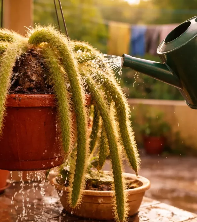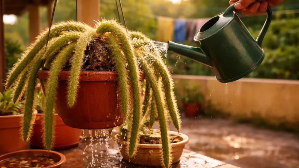 O cacto rabo-de-macaco cresce vistoso com pouca água, mas duas regas erradas seguidas iniciam um apodrecimento silencioso na base — e quase ninguém percebe no começo. A cena é comum em varandas ensolaradas do interior: a planta está linda, pendendo como uma cascata verde, até que, de repente, perde firmeza sem aviso claro.