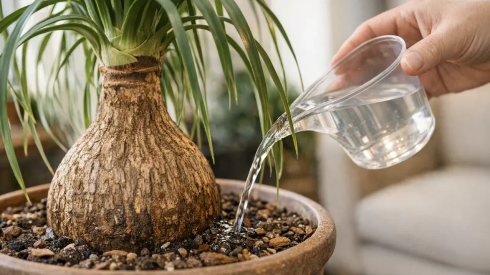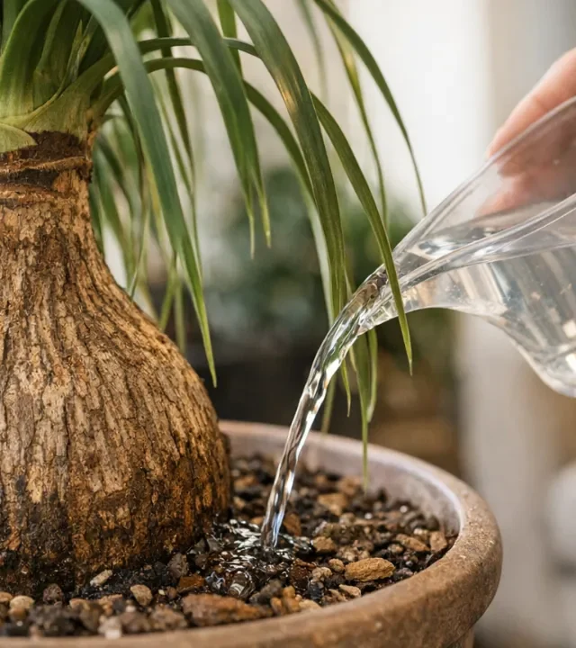 Apesar da fama de “sobrevivente”, a pata-de-elefante não é invencível. A dica é observar o solo: ele deve estar completamente seco antes de qualquer nova rega. Uma boa prática é enfiar o dedo até a segunda falange no substrato — se estiver seco até lá, pode molhar. E, mesmo assim, apenas até a água começar a sair pelos furos do vaso.