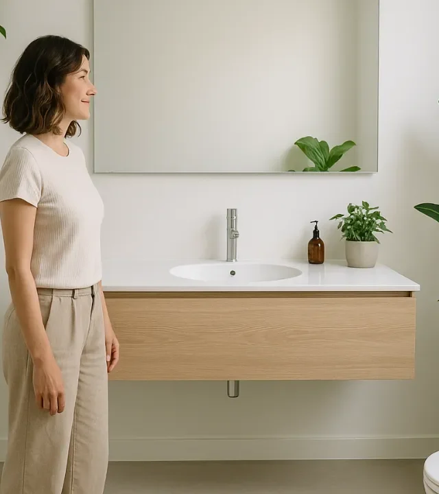 Não basta escolher as plantas para banheiros certos. A distribuição delas no ambiente é o que garante um resultado de impacto. Vasos no chão com alturas variadas criam camadas e equilibram o visual. Nichos embutidos com espécies pendentes acrescentam profundidade e movimento. E se o espaço for pequeno, uma única planta bem posicionada — como um vaso com lírio-da-paz sobre a bancada — já transforma o cenário.