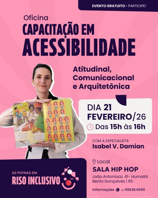 O conteúdo traz temas focados em três características primordiais para a inclusão: atitudinal, comunicacional e arquitetônica. A oficina é gratuita e aberta ao público e integra o projeto cultural “As Phynas em Riso Inclusivo”.