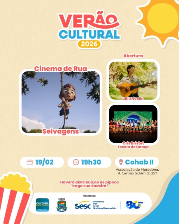 A programação inicia nesta quinta-feira, dia 19 de fevereiro, no Bairro Cohab, com o Cinema de Rua. Na ocasião será exibido o filme “Selvagens”, dirigido por Claude Barras. A abertura ficará por conta da cantora Jai Trivelin e a apresentação de Cris Bristot Escola de Dança.