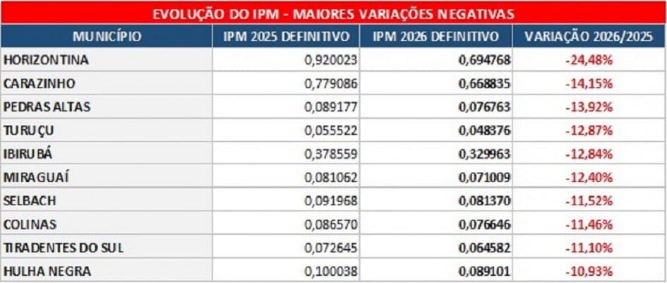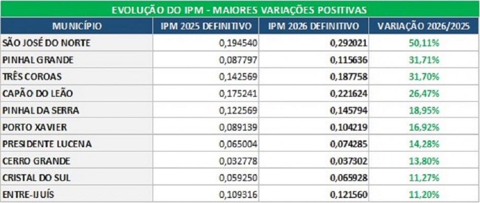 No panorama estadual, 256 municípios apresentaram crescimento no índice em relação a 2025, enquanto 241 registraram queda. São José do Norte teve a maior alta percentual do Estado, com avanço de 50,11%, e Horizontina apresentou a maior redução, com queda de 24,48%.