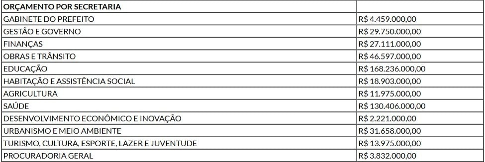 Para manutenção urbana, onde estão inclusas ruas, iluminação pública, praças e demais espaços coletivos, serão destinados R$ 21 milhões, alocados na Secretaria de Obras e Trânsito, que detém o terceiro maior orçamento. O município também prevê R$ 12 milhões para investimentos em pavimentação e outras obras de infraestrutura.