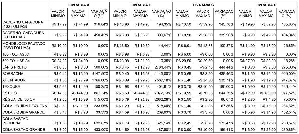 O documento revela grandes variações de preço entre os produtos. Por exemplo, o estojo foi encontrado por valores entre R$ 5,50 e R$ 444,00; o apontador, entre R$ 0,39 e R$ 29,98; e a borracha, entre R$ 0,40 e R$ 16,99. Essa disparidade se repete em outros itens da lista.