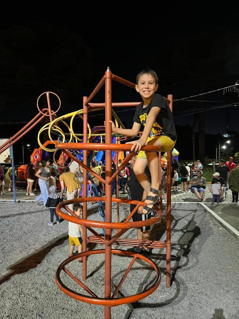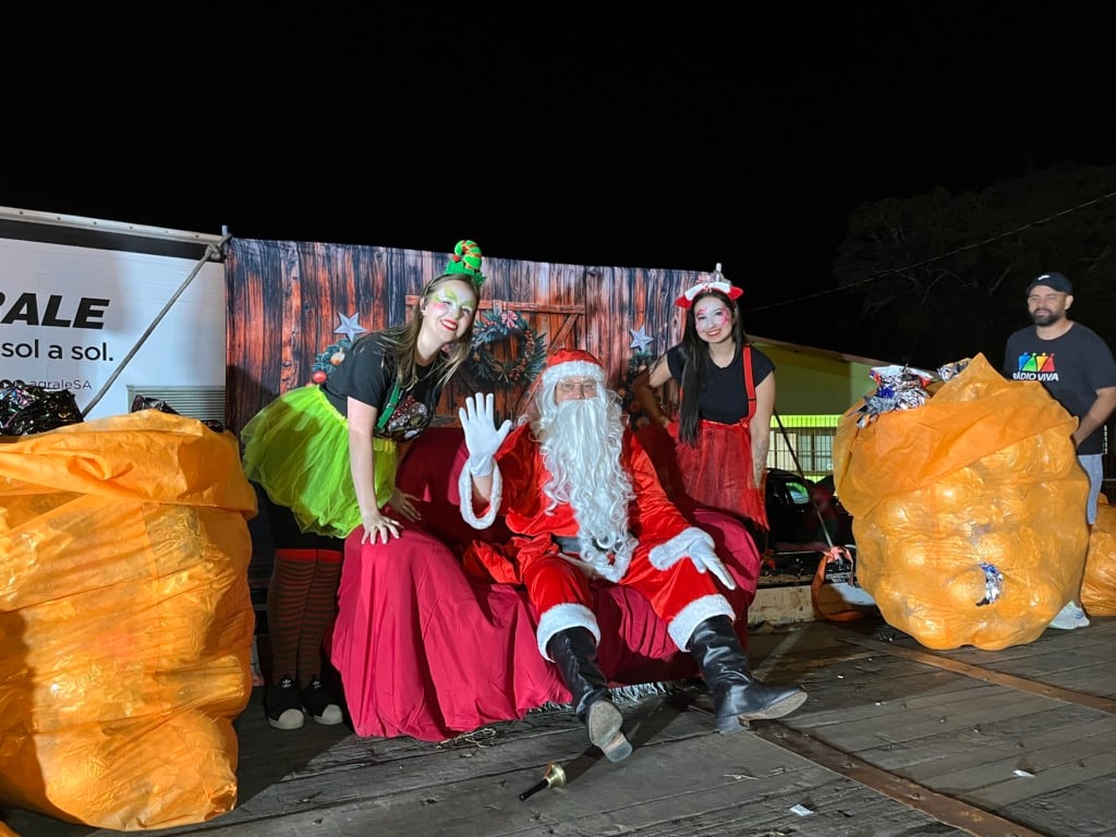 Entre as atrações, o ponto alto da noite foi a chegada do Papai Noel, que percorreu a praça em um carro iluminado, acompanhado de seus ajudantes, distribuindo brinquedos e encantando as crianças. A programação contou ainda com uma edição especial do Chimarreando com a Viva, brinquedos infláveis gratuitos e apresentações artísticas que emocionaram o público presente. Ao longo da noite, também houve distribuição gratuita de pipoca, cachorro-quente, polenta e refrigerante, fortalecendo o clima de partilha e acolhimento entre os participantes.