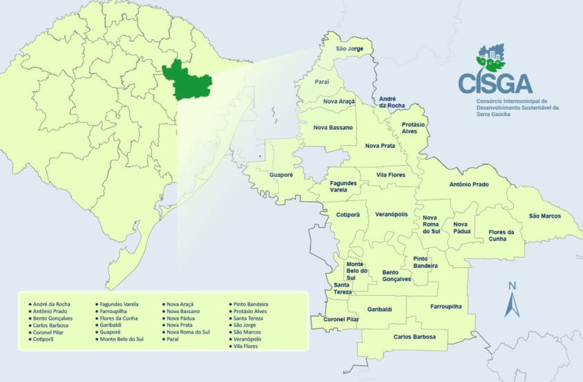 Municípios Consorciados: André da Rocha, Antônio Prado, Bento Gonçalves, Carlos Barbosa, Coronel Pilar, Cotiporã, Fagundes Varela, Farroupilha, Flores da Cunha, Garibaldi, Guaporé, Monte Belo do Sul, Nova Araçá, Nova Bassano, Nova Pádua, Nova Prata, Nova Roma do Sul, Paraí, Pinto Bandeira, Protásio Alves, Santa Tereza, São Jorge, São Marcos, Veranópolis e Vila Flores.