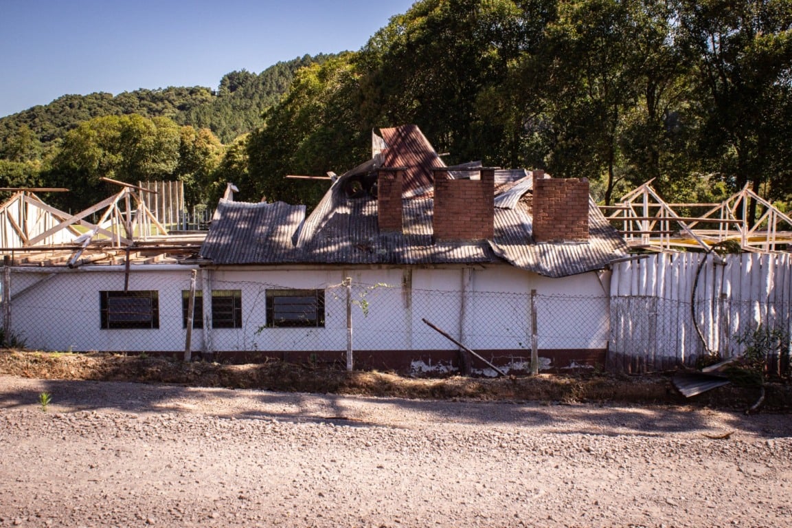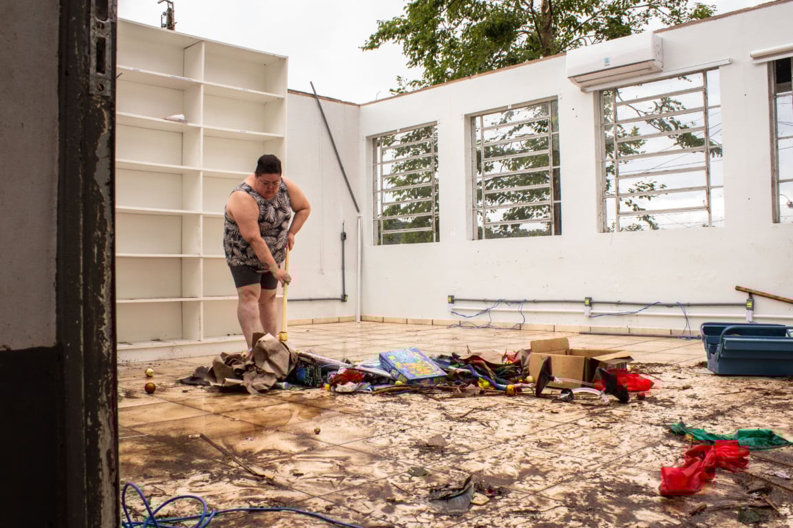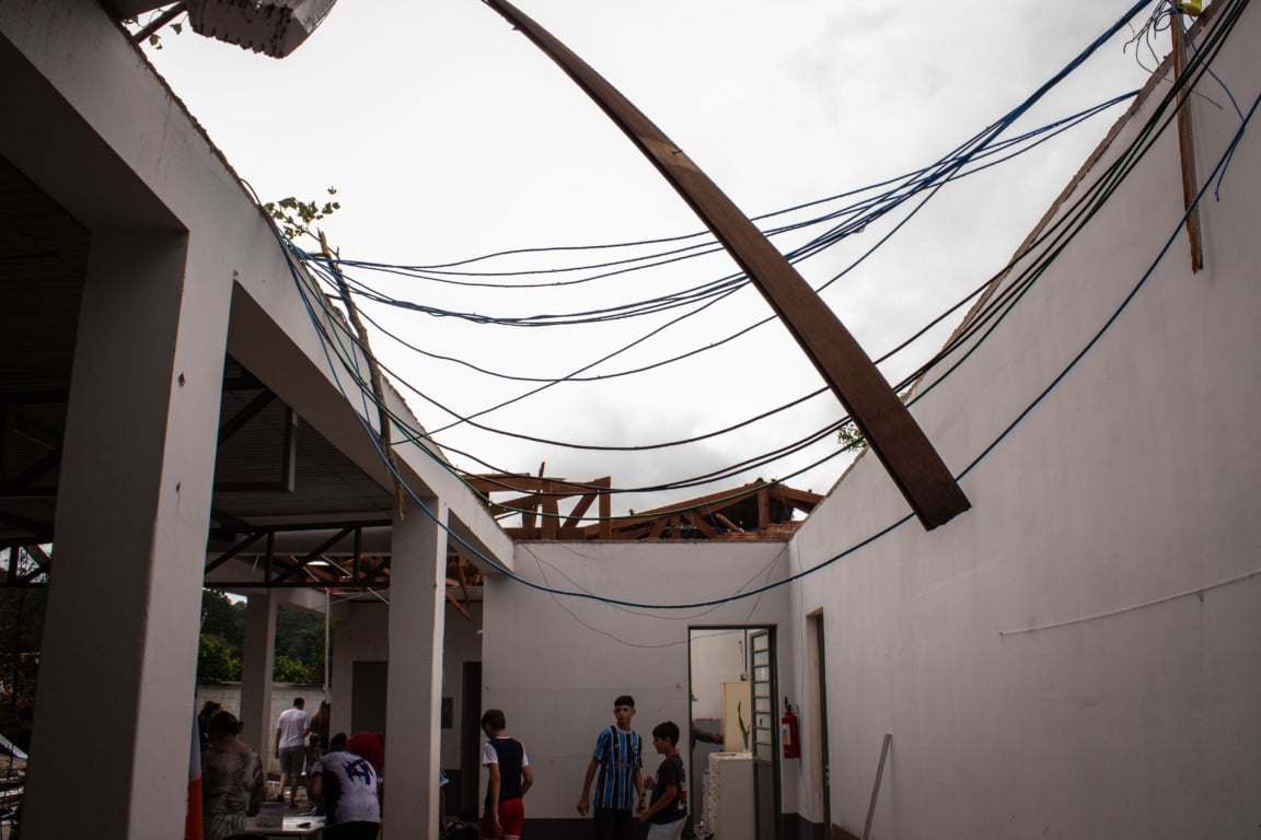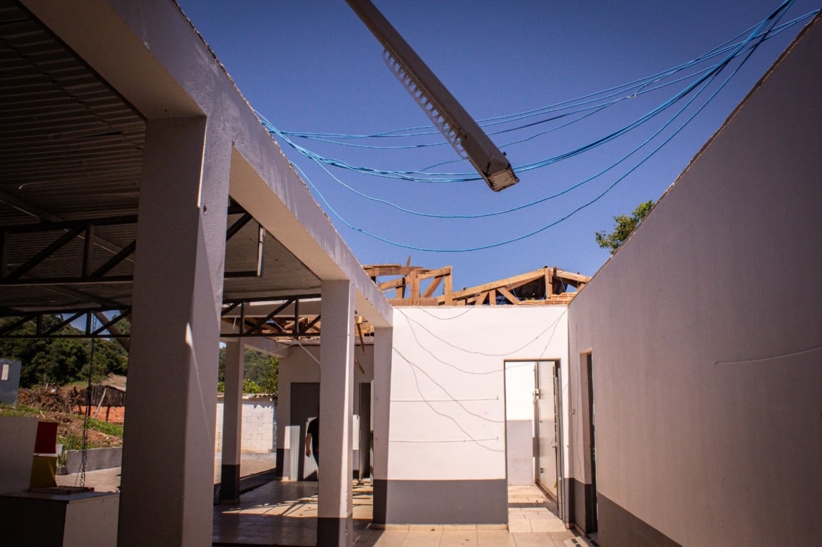 - Na Escola José Chesini: A escola foi destelhada quase que por completo, com danos internos significativos. As obras de reconstrução ainda não avançaram visivelmente, evidenciando a complexidade do serviço.