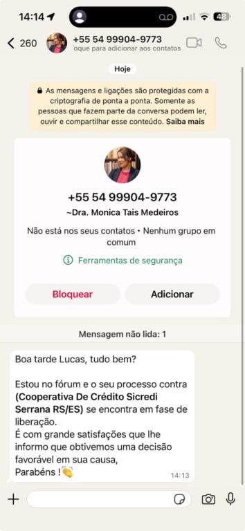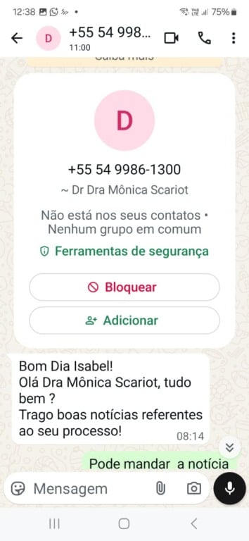 “Eles pegam fotos dos nossos perfis no Facebook e Instagram e enviam mensagens dizendo que o processo teve sentença favorável. A partir disso, tentam coletar dados pessoais e pedir PIX”, relata.