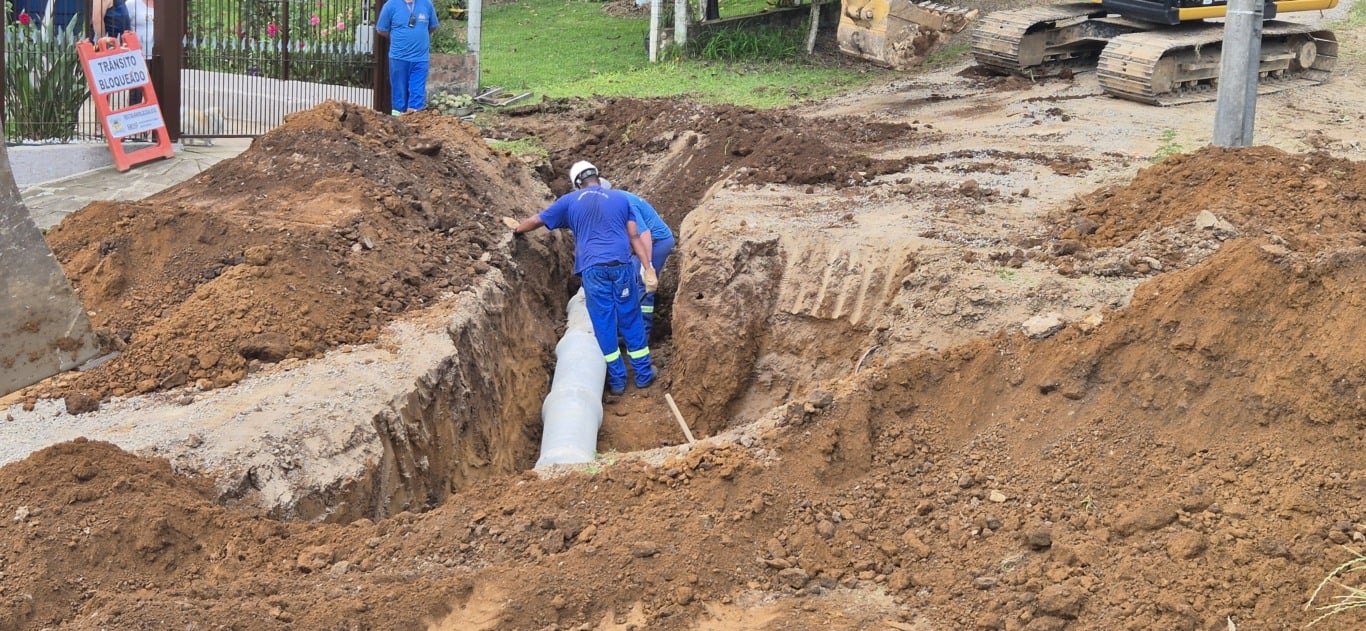 As escavações e assentamentos de tubulação seguem em ritmo avançado, com equipes atuando na obra ao longo da via para garantir a substituição das estruturas antigas e a implantação do novo sistema.