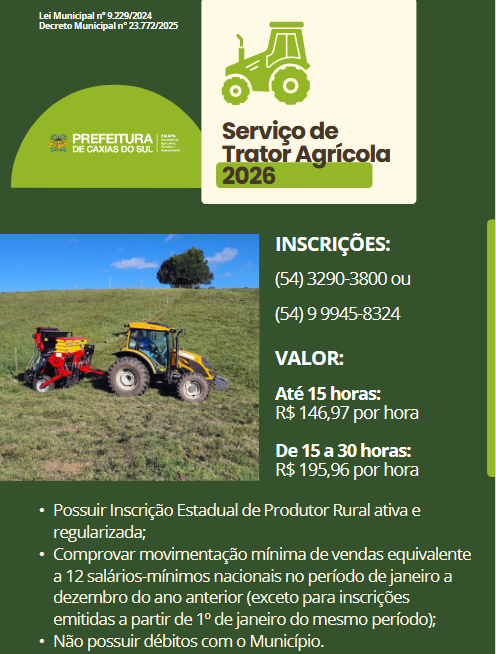 A Secretaria Municipal da Agricultura, Pecuária e Abastecimento (SMAPA) de Caxias do Sul anunciou que a forma de inscrição no Programa Municipal de Recuperação e Manutenção da Fertilidade dos Solos da Propriedade Rural Caxiense (Tratores Agrícolas) será alterada a partir de janeiro de 2026. As inscrições deixarão de ser feitas nas subprefeituras e passarão a ser centralizadas na SMAPA, exclusivamente por telefone.