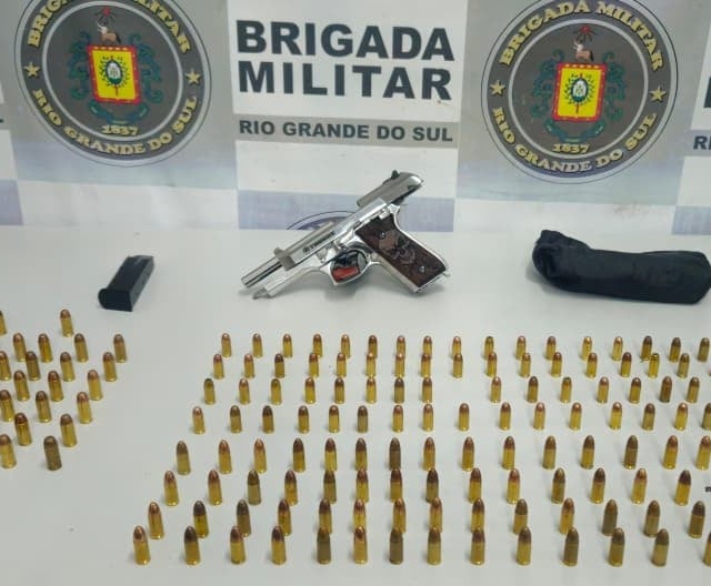 Com o jovem, os policiais encontraram uma pistola Taurus PT 101 municiada e um carregador. Além de uma pochete com 187 munições, sendo: 44 de calibre .40, 72 de 9mm e 71 calibre .380.