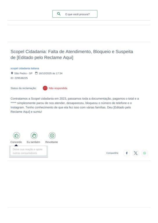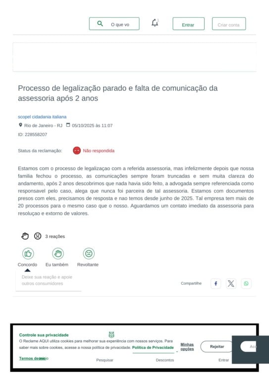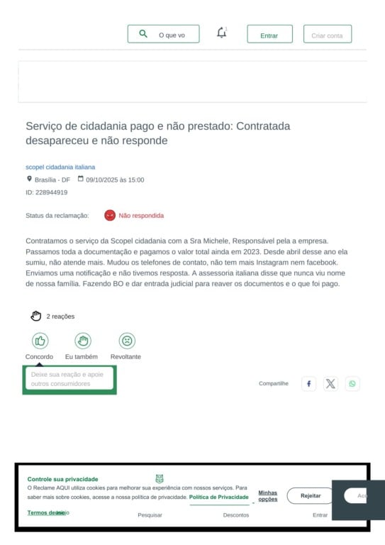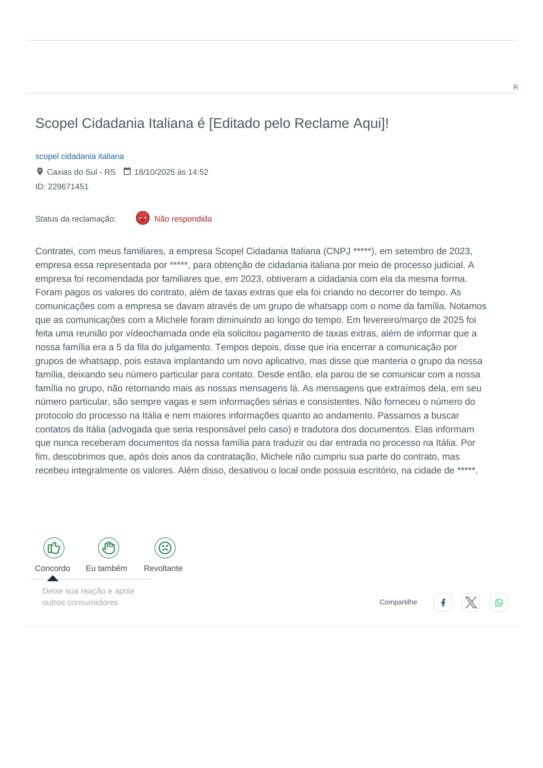 Além disso, a maioria dos clientes jamais recebeu nota fiscal pelos valores pagos, tampouco qualquer prestação de contas que comprovassem o andamento dos processos. Em diversos casos, mesmo após o pagamento integral, os processos nunca foram protocolados na Itália, embora a investigada afirmasse o contrário em mensagens e relatórios informais que nunca foram comprovados.