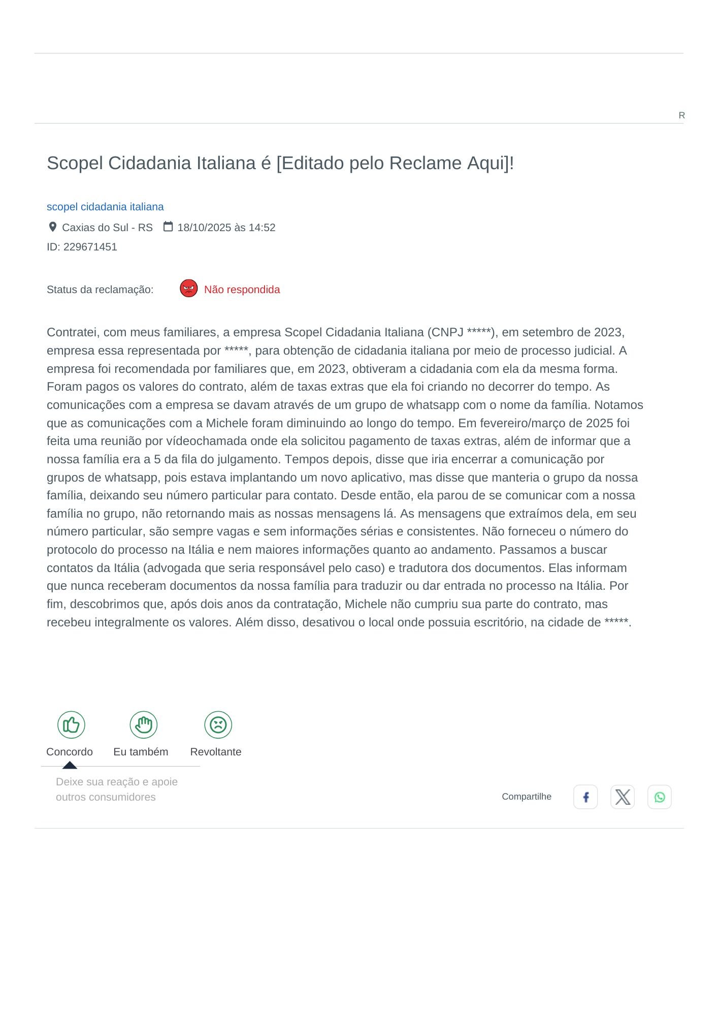 Serra Gaúcha - O sonho da cidadania italiana se transformou em pesadelo financeiro e judicial para centenas de famílias espalhadas por São Paulo, Santa Catarina, Rio Grande do Sul, Tocantins e Goiás, e até para brasileiros que vivem no exterior, como nos Estados Unidos e na Austrália. O centro do esquema, segundo um dossiê elaborado pela defesa de um grupo de vítimas, seria Michele Scopel Reginatto, empresária responsável pela Scopel Cidadania Italiana, com sede em Antônio Prado, na Serra Gaúcha. Ela é investigada por estelionato e falsidade ideológica. Até o momento da postagem desta matéria, 27 boletins de ocorrência estavam anexados ao dossiê.