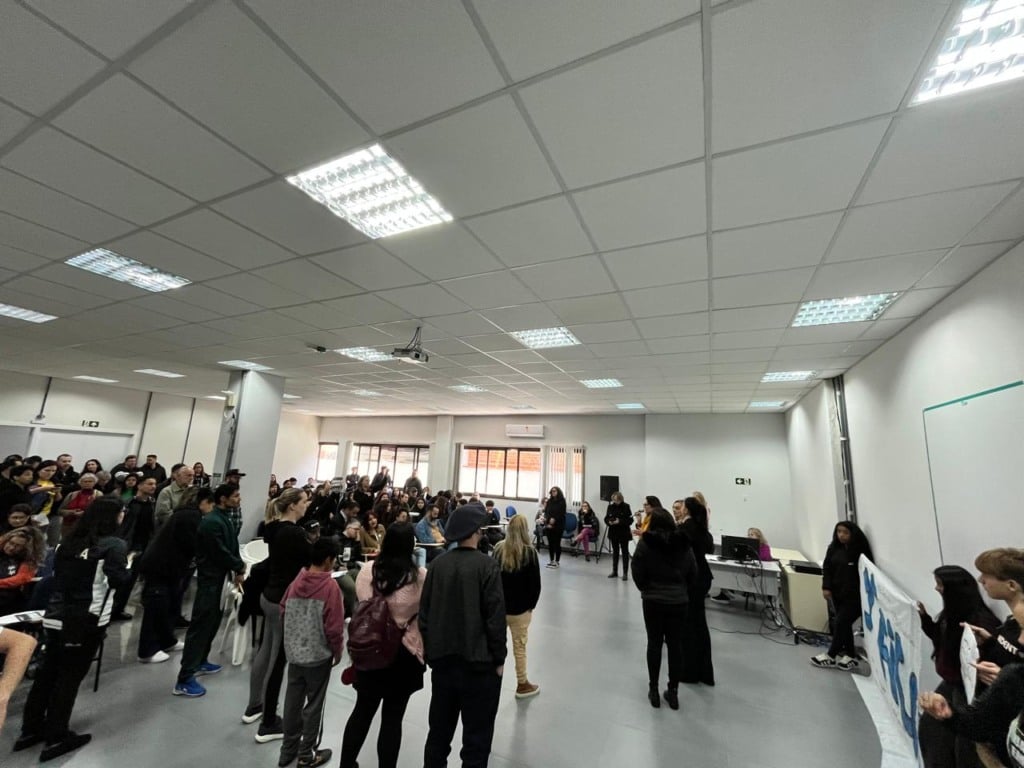 Cerca de 100 pessoas entre pais, alunos e professores da rede municipal de ensino participaram de uma manifestação na manhã desta segunda-feira (20), em frente à sede da Secretaria Municipal da Educação (SMED), em Caxias do Sul, contra a decisão da prefeitura de encerrar o 9º ano em 15 escolas municipais a partir de 2026.