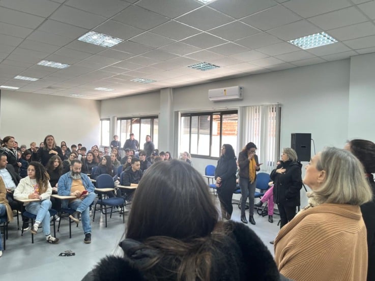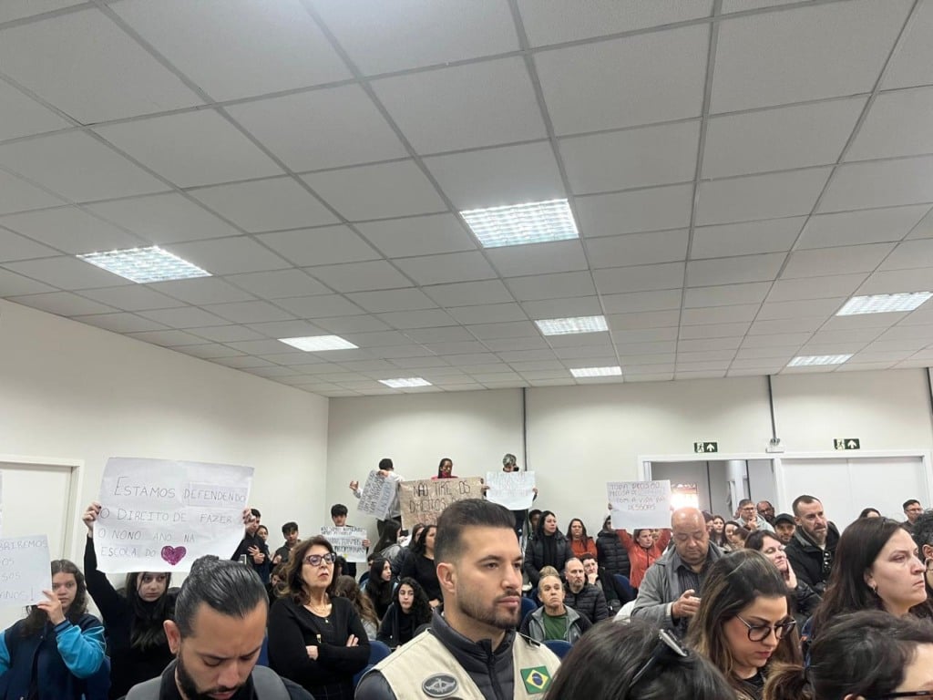 Durante o ato, os participantes carregaram cartazes com frases de repúdio, demonstrando insatisfação com a medida. O clima ficou tenso e, em meio às palavras de ordem contra a decisão e também contra a secretária de Educação Marta Fattori, ela teve dificuldade para se pronunciar no início da reunião.