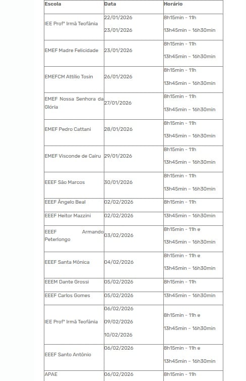 A Secretaria Municipal de Educação inicia, a partir desta quinta-feira (22) o cadastro e a renovação das carteirinhas dos alunos das redes municipal e estadual que utilizam o transporte escolar em Garibaldi, conforme cronograma organizado por escola para o ano letivo de 2026.