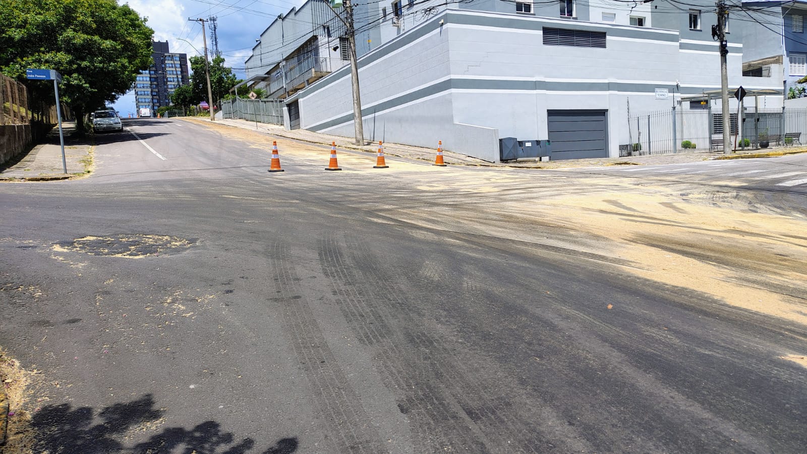 Para quem acessa a rua pela BR-470, o sentido de subida está bloqueado. Cones foram instalados para sinalizar o local, e serragem foi aplicada nos pontos onde o óleo escorreu, a fim de reduzir o risco de derrapagens.