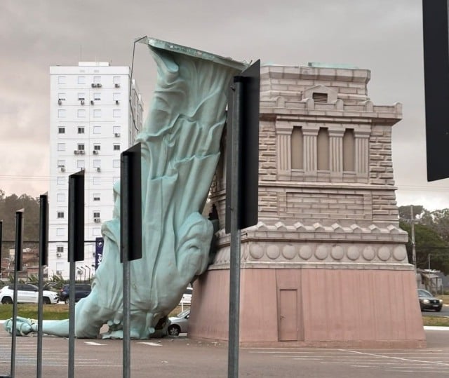 Região Metropolitana e Rio Grande do Sul - Nesta segunda-feira (15), uma forte ventania provocada por um sistema de baixa pressão que atuou sobre o Rio Grande do Sul derrubou uma das réplicas da Estátua da Liberdade instaladas em frente a uma loja da rede varejista Havan em Guaíba (RS), segundo relatos de moradores e vídeos que circulam nas redes sociais.