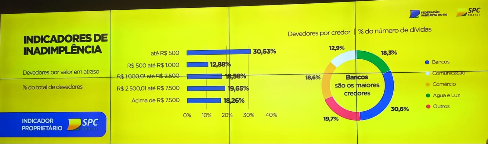 Quando os dados se referem à inadimplência nota-se que no primeiro quadrimestre deste ano o consumidor se manteve com as contas em dia, de maio em diante as taxas oscilaram, batendo em 11,76% em junho e ficando em 10,70 em outubro. Estes dados indicam, segundo Pioner, que o crédito está esgotado e que juros bancários são o principal fato de endividamento – 30,6% das dívidas são com bancos, 18,6% com o comércio e 18,30% com água e luz. As dívidas nesta forma mostram que o consumidor busca outras formas de crédito – daí a volta dos carnês do próprio lojista financiando quem já não teria mais possibilidade de contrair dívidas. Para Pioner, toda e qualquer forma de educação financeira ao consumidor é muito relevante.