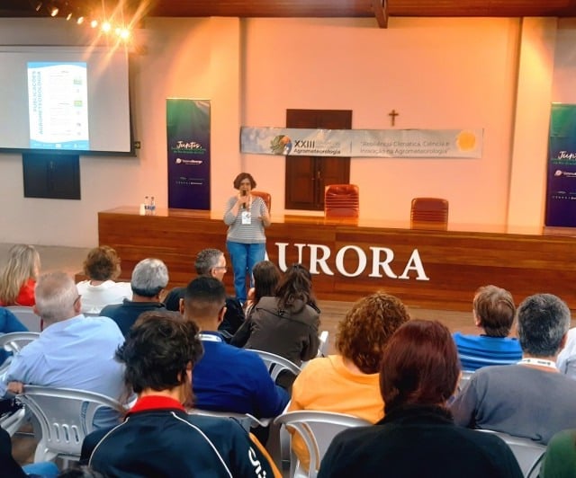Prevista para a estação experimental da Aurora em Pinto Bandeira, a visita foi transferida para o auditório devido à chuva. A pesquisadora Loana Cardoso apresentou boletins agrometeorológicos produzidos pelo Departamento de Diagnóstico e Pesquisa Agropecuária (DDPA/Seapi) e a plataforma de alertas Simagro-RS.