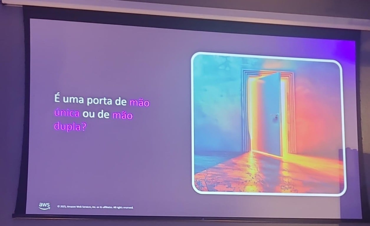 O evento também contou com a participação de Lino Maggi, líder de arquitetura da AWS (Amazon Web Services), que apresentou o conceito “One-way door ou Two-way door”, metáfora usada pela empresa para definir níveis de decisão dentro das equipes. Segundo ele, se uma decisão pode ser revertida ou ajustada, qualquer colaborador tem autonomia para tomá-la, fortalecendo a cultura de inovação e agilidade.